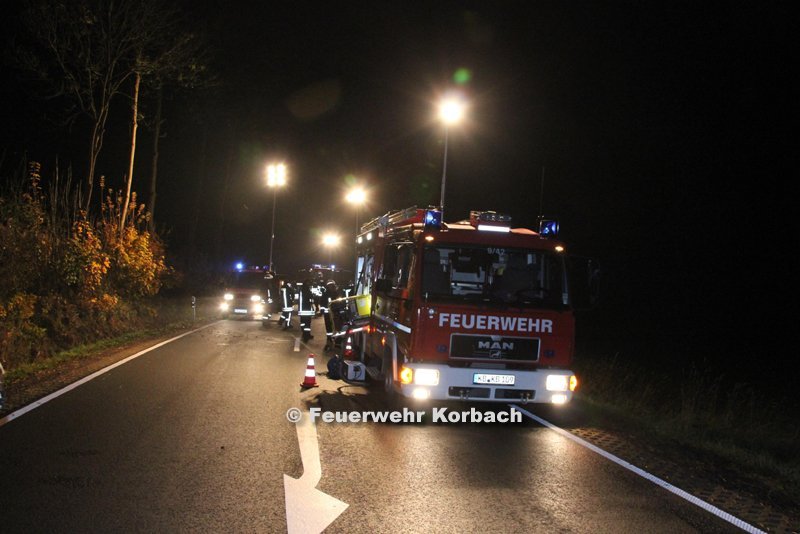 Daraufhin rückten zunächst die Besatzung eines Rettungswagens und der Korbacher Notarzt zur Unfallstelle aus. Weil die Rettungskräfte den Fahrer nicht aus dem schräg liegenden Auto befreien konnten, forderten sie die Feuerwehr an. Die Brandschützer aus Meineringhausen unterstützten den Rettungsdienst, und noch vor Eintreffen der ebenfalls alarmierten Korbacher Kameraden war der 19-Jährige befreit. Hdraulisches Gerät brauchte nicht eingesetzt zu werden. Die Feuerwehrleute sicherten aber die Unfallstelle ab und leuchteten sie aus. Einsatzleiter war der Korbacher Stadtbrandinspektor Friedhelm Schmidt.