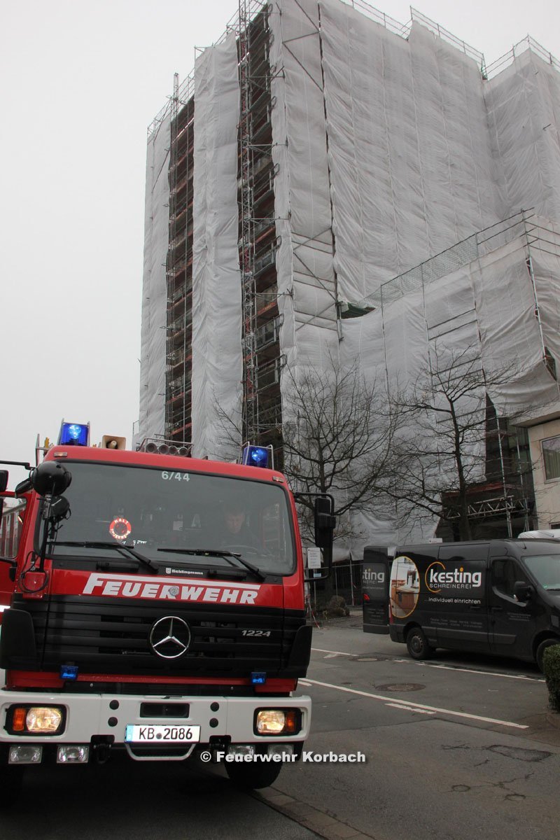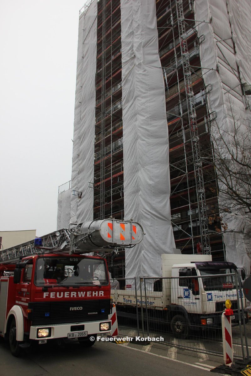 Die Leitstelle alarmierte nach Eingang des Feueralarms um 10.41 Uhr sofort die Korbacher Feuerwehr, die Augenblicke später mit vier Fahrzeugen und gut 20 Mann Besatzung ausrückte. Die Feuerwehrleute stiegen auf das derzeit montierte Baugerüst und fanden rasch die Stelle, an der der Alarm ausgelöst worden war. In zwei Räumen im vierten Stock öffneten die Einsatzkräfte die Decken, um nach möglicherweise vorhandenen Glutnestern zu suchen. Dabei kam auch die Wärmebildkamera zum Einsatz. Fündig wurden die Feuerwehrleute bei ihrer Suche nicht.