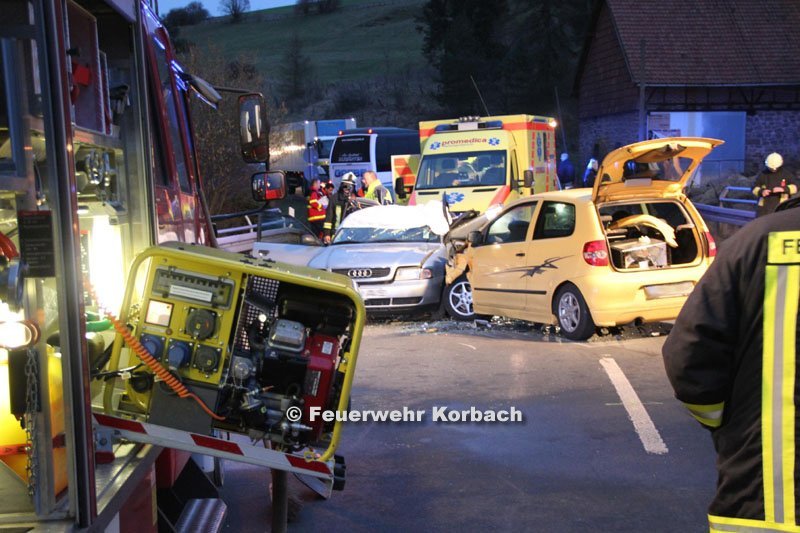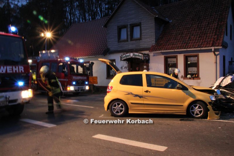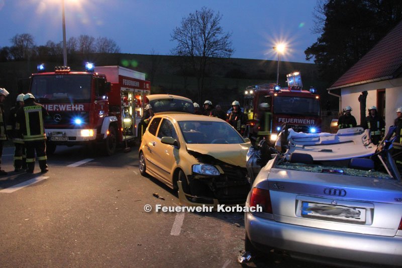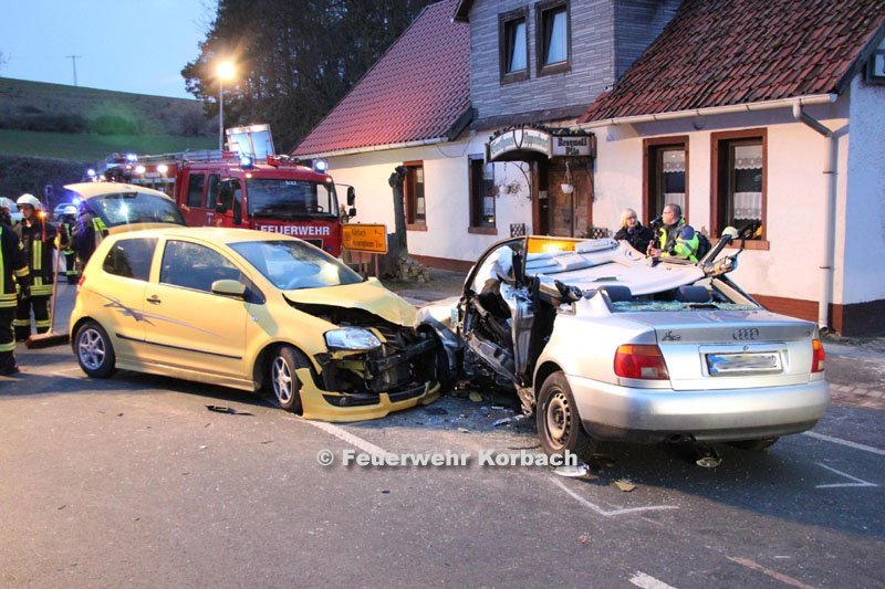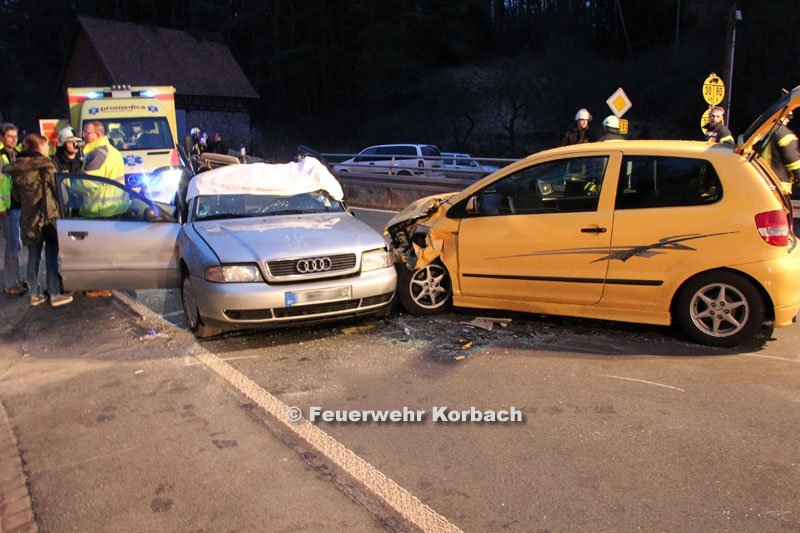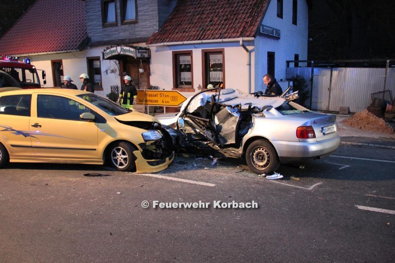 Gegen 16.45 Uhr war es zu dem Zusammenstoß gekommen, als ein Audifahrer von Alraft kommend nach links auf die B 251 in Richtung Korbach abbiegen wollte und dabei einen von links kommenden VW Fox übersah. Der 18 Jahre alte Foxfahrer prallte dem anfahrenden Audi in die Fahrerseite, wobei beide Fahrer schwere Verletzungen erlitten. Bei dem Aufprall wurde der Audifahrer - vermutlich der 71 Jahre alte Halter des Wagens aus Korbach - hinter dem Steuer eingeklemmt.