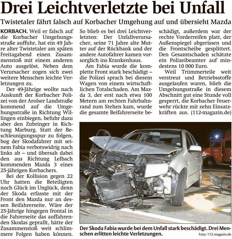 Der 49-Jährige wollte nach Auskunft der Korbacher Polizei von der Arolser Landstraße kommend auf die Umgehungsstraße in Richtung Willingen einbiegen, befuhr dazu aber den Zubringer in Richtung Marburg. Statt der Beschleunigsspur zu folgen, bog der Skodafahrer mit seinem Fabia verbotswidrig nach links ab - und übersah dabei auch noch den aus Richtung Lelbach kommenden Mazda 3 eines 25-jährigen Korbachers.