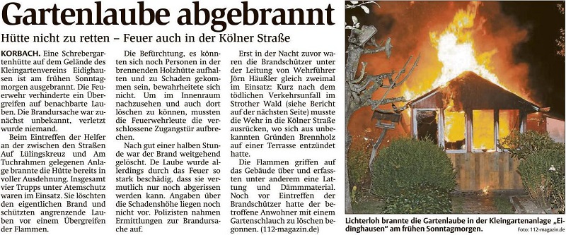 Beim Eintreffen an der zwischen den Straßen Auf Lülingskreuz und Am Tuchrahmen gelegenen Kleingartenanlage gegen 5 Uhr brannte die Hütte bereits in voller Ausdehnung. Insgesamt vier Trupps unter Atemschutz waren im Einsatz, löschten den eigentlichen Brand und schützten angrenzende Lauben. Die Befürchtung, es könnten sich noch Personen in der brennenden Holzhütte aufhalten und zu Schaden gekommen sein, bewahrheitete sich nicht. Um im Innenraum nachzusehen und auch dort löschen zu können, mussten die Feuerwehrleute die verschlossene Zugangstür aufbrechen.