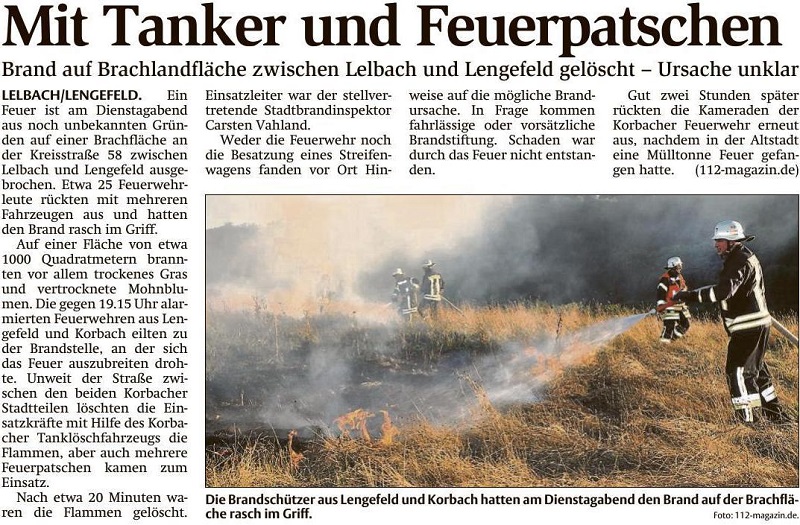 Auf einer Fläche von etwa 1000 Quadratmetern brannten vor allem trockenes Gras und vertrocknete Mohnblumen. Die gegen 19.15 Uhr alarmierten Feuerwehren aus Lengefeld und Korbach eilten zu der Brandstelle, an der sich das Feuer auszubreiten drohte. Unweit der Straße zwischen den beiden Korbacher Stadtteilen löschten die Einsatzkräfte mit dem Schnellangriff des Korbacher Tanklöschfahrzeugs und aus drei C-Leitungen, aber auch mehrere Feuerpatschen kamen zum Einsatz.