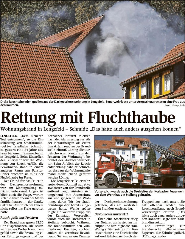 Gegen 13:25 Uhr wurden die Feuerwehren aus Lengefeld und Korbach sowie der Rettungsdienst und der Korbacher Notarzt mit dem Einsatzstichwort F 2 Y Wohnungbrand - Person noch in der Wohnung - alarmiert.