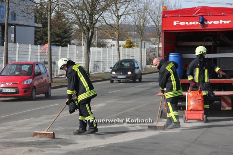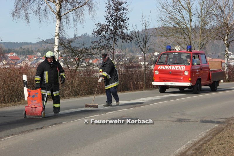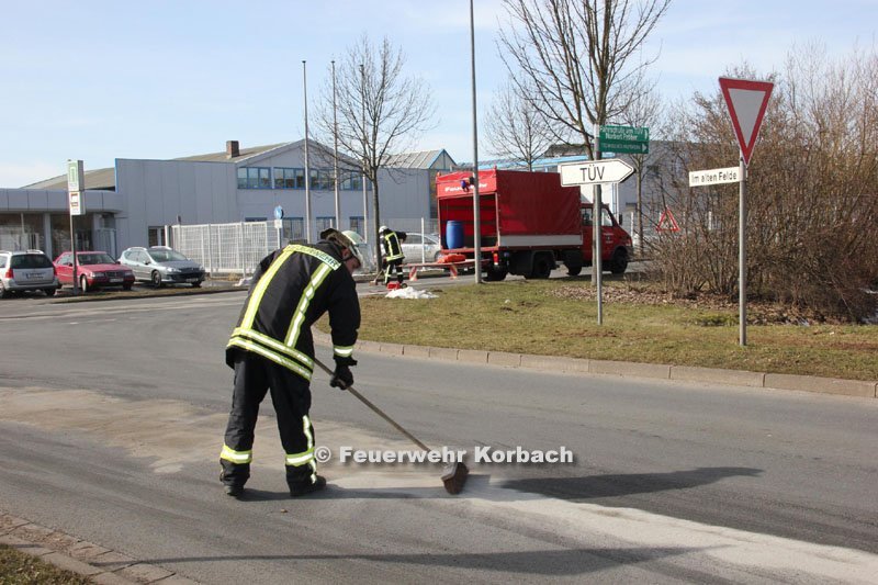 Ab etwa 11.15 Uhr waren Feuerwehr und Straßenmeisterei über einen längeren Zeitraum damit beschäftigt, die rutschige Spur zu beseitigen. Die Feuerwehr setzte dabei neben Ölbindemittel auch eine spezielle Seifenlauge ein, um den Asphalt wirksam zu reinigen.