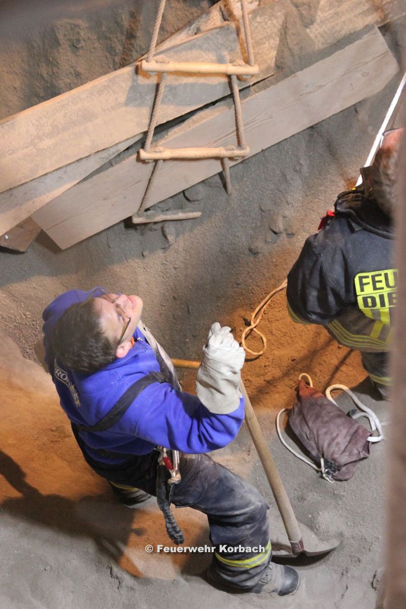 Zur Rettung hatten die Feuerwehrleute zunächst mit einem Schneidbrenner eine Öffnung in die Silowand geschnitten, um das Material hinaus zu befördern. So wurde der Mann Stück für Stück freigebraben. Um den Verschütteten bei Temperaturen um den Gefrierpunkt zu wärmen, nahmen die Brandschützer mehrere Leuchten vor - die Strahler spendeten ausreichend Wärme. Noch während Feuerwehrleute und Rettungskräfte sich um den Mann, der wegen des feinen Materials seine Beine nicht bewegen konnte, kümmerten, rückte die Feuerwehr aus Korbach mit dem Drehleiterfahrzeug an. Zunächst hatten die Einsatzleiter Torsten Behle und Karl-Wilhelm Römer die Möglichkeit in Betracht gezogen, den Arbeiter mit einer Krankentrage über den Korb der Drehleiter nach unten zu befördern. Dies war aber wegen des guten Zustands des Mannes nicht nötig.