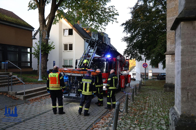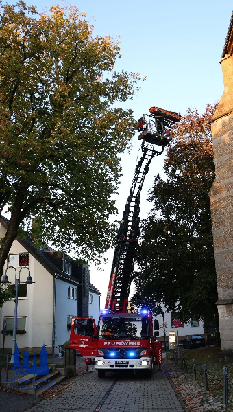 Die Einsatzstelle lag in einer der schmalsten Straßen der Korbacher Altstadt. Die Drehleiter musste unmittelbar neben der Kilianskirche in Position gebracht werden. Neben der engen Bebauung sorgte auch der alte Baumbestand für eine Herausforderung.