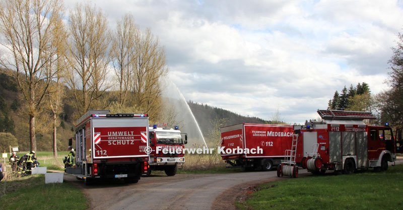 Die Gülle gelangte schließlich in einen Nebenarm der Aar und wurde von dort ins Tal gespült. Die Feuerwehren aus Hillershausen, Medebach, Eppe, Nieder-Schleidern, Alleringhausen, Goldhausen, Nordenbeck und Korbach rückten aus. Unter Leitung von Stadtbrandinspektor Friedhelm Schmidt und Stellvertreter Carsten Vahland waren etwa 60 Feuerwehrleute im Einsatz. Erstes Augenmerk galt dem Schutz der Aar - schließlich befinden sich flussabwärts Fischteiche. Die Brandschützer setzten unter anderem sogenannte Blasen, die sie mit Pressluft füllten und mit denen sie Durchläufe verschlossen. In das davor angestaute und mit Gülle verunreinigte Wasser legten sie Saugschläuche und pumpten das Wasser über C-Schläuche auf angrenzende Wiesen.