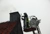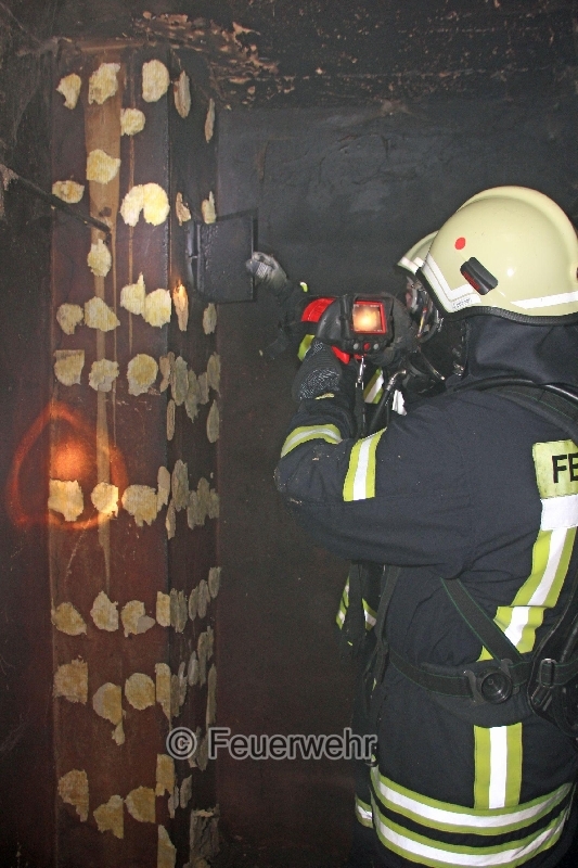 Durch undichte Stellen im Schornstein gelangte Rauch in eine Räucherkammer auf dem Dachboden. Ein Trupp mit Atemschutzgeräten untersuchte die Esse nach Rissen. Die Einsatzkräfte nahmen auf der Suche nach Brandherden auch Schieferplatten ab und fanden mit der Wärmebildkamera mehrere große Glutnester.