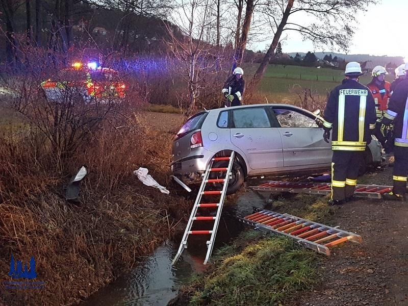 Dort war der Fahrer mit zwei weiblichen Insassen und einem Hund auf regennasser Fahrbahn ausgangs einer Rechtskurve mit seinem Pkw nach links von der Fahrbahn gerutscht und war an einem Wasserdurchlass auf der Fahrerseite zum Liegen gekommen. Während eine Person das Fahrzeug allein verlassen konnte, mussten die beiden anderen Insassen aus dem Fahrzeug befreit werden.