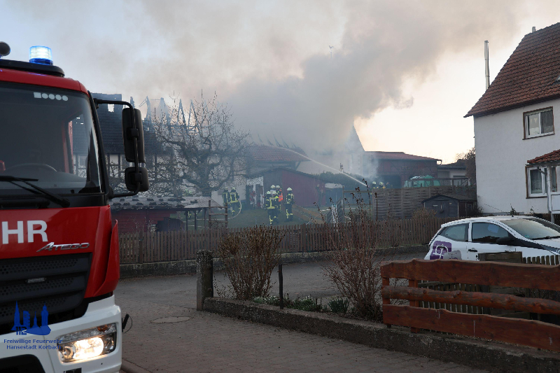 Bereits auf der Anfahrt der Einsatzkräfte waren hohe Flammen aus dem Dachstuhl eines Gebäudes sichtbar, wodurch das Alarmstichwort auf F3 erhöht wurde. Bei der Ankunft vor Ort stellte sich heraus, dass der Brand in einer Scheune war, die mit einem angrenzenden Wohnhaus verbunden war. Der Scheunenbereich stand zu diesem Zeitpunkt bereits in Vollbrand. Die Feuerwehr setzte alles daran, das Wohnhaus vor den Flammen zu schützen. Trotz intensiver Löschversuche konnte das Wohnhaus nur teilweise gerettet werden. Durch das eingeleitete Löschwasser ist es derzeit jedoch unbewohnbar, konnte aber vor den Flammen geschützt werden. Die Bewohner des Hauses konnten sich rechtzeitig retten.