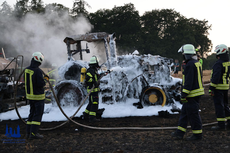 Das Feuer griff auf den Trecker sowie das umliegende Feld über. Die Rauchentwicklung war weithin sichtbar.