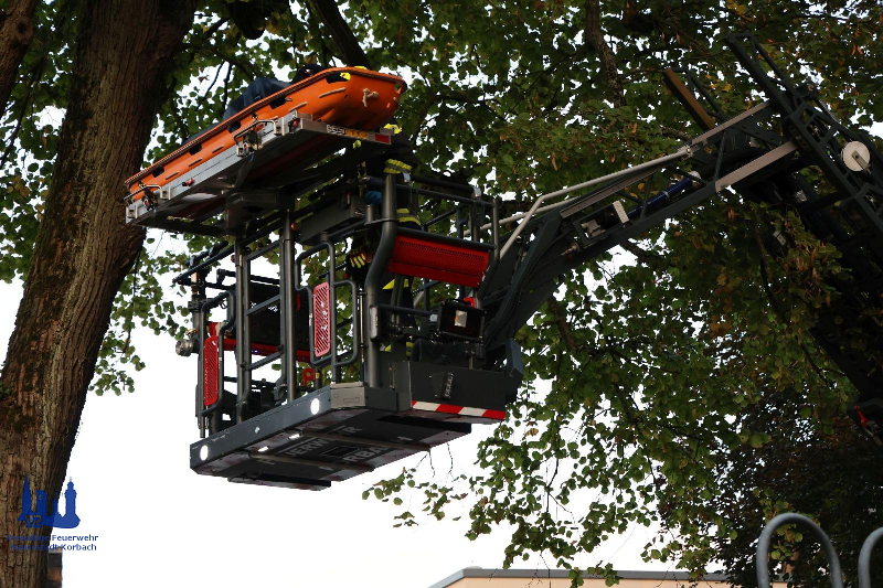 Die Einsatzstelle lag in einer der schmalsten Straßen der Korbacher Altstadt. Die Drehleiter musste unmittelbar neben der Kilianskirche in Position gebracht werden. Neben der engen Bebauung sorgte auch der alte Baumbestand für eine Herausforderung.