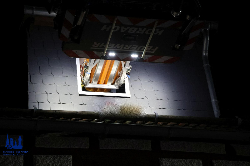 Nach der Vorbereitung des Patienten, wurde dieser von den Rettungskräften gemeinschaftlich über den Rettungskorb der Drehleiter sicher und zeitnah an den vor dem Haus wartenden RTW mit seiner Besatzung übergeben.