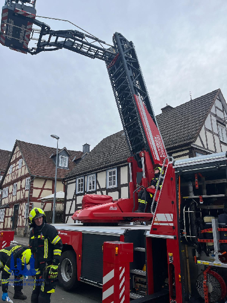 Nach der Vorbereitung des Patienten, wurde dieser von den Rettungskräften gemeinschaftlich über den Rettungskorb der Drehleiter sicher und zeitnah an den vor dem Haus wartenden RTW mit seiner Besatzung übergeben.